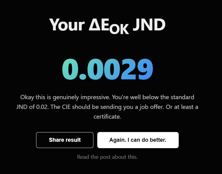 Artist friends have been sharing Keith Cirkel’s “Just Noticeable Difference” test. At my best I landed on .0029 which is pretty dang good. I chalk it up to so much time spent working with color throughout my career.